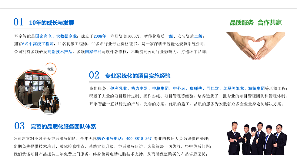 合肥市環(huán)宇智能工程有限公司成立于2008年科創(chuàng)版上市企業(yè),現(xiàn)注冊資金1000整,電子與智能化系統(tǒng)集成資質(zhì)壹級,安防資質(zhì),是“國家高新技術(shù)企業(yè)”、“合肥市高新技術(shù)產(chǎn)品認(rèn)定企業(yè)”、“安徽省安防協(xié)會會員單位”、“AAA級信用等級認(rèn)證企業(yè)”、“AAA級重合同守信用企業(yè)”、“合肥市創(chuàng)新型企業(yè)”、是行業(yè)領(lǐng)先的智能化整體解決方案的集成商